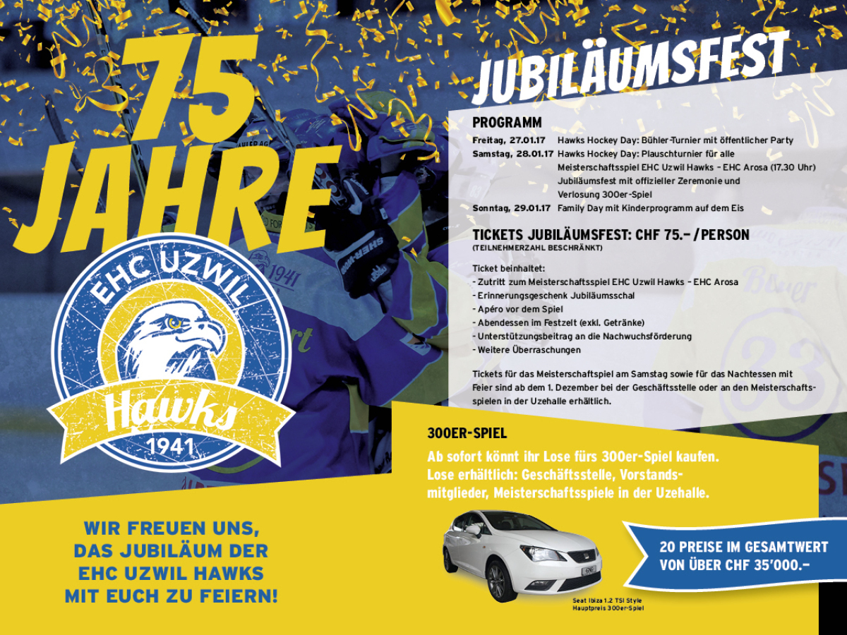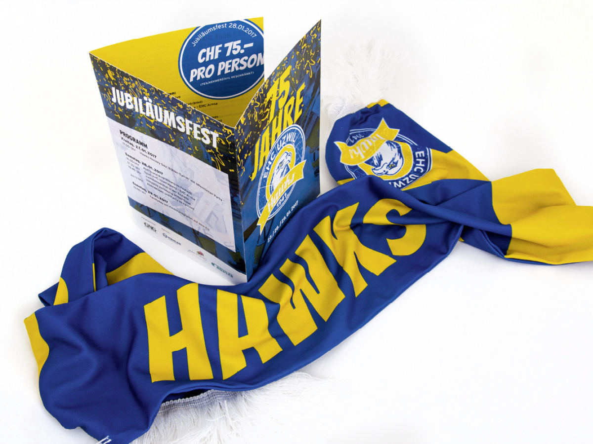 Zum 75-Jahr-Jubiläum der EHC Uzwil Hawks hat KA BOOM als offizieller Kommunikationspartner diverse Werbemittel wie den Flyer, den Jubiläumsschal oder ein Inserat gestaltet. Herzliche Gratulation zum 75-jährigen Bestehen, EHC Uzwil Hawks.