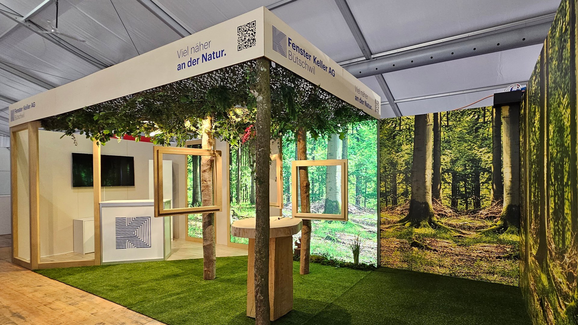 Der Stand sollte die Werte des Unternehmens – Qualität, Nachhaltigkeit, Tradition, Innovation und die Rolle der Mitarbeitenden – erlebbar machen. Unter dem Motto «Viel näher an der Natur» versetzt der Stand die Besuchenden direkt in eine Waldatmosphäre. Holz- und Holz-Metall-Fenster werden aus dem natürlichen Kontext heraus präsentiert, wodurch das Produkt bewusst in den Hintergrund rückt und die Marke sowie ihre Werte im Vordergrund stehen.