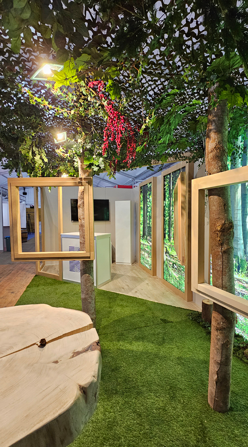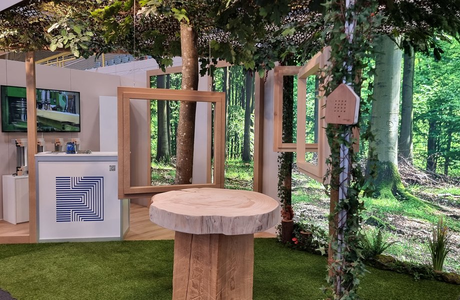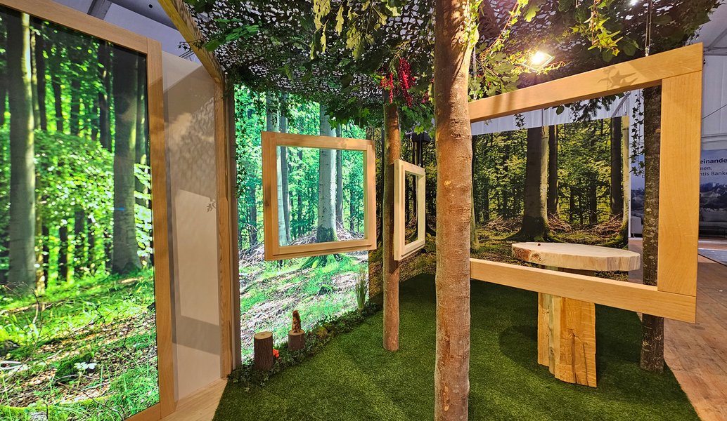 «Vom Baum zum Fenster» – die Messebesucher erleben den natürlichen Ursprung der Produkte live. Echte Baumstämme, Holzrahmen, Wald-Backdrops und ein Videoscreen zeigen die Herstellung der Fenster vom Rohstoff Holz bis zum fertigen Produkt. So wird die Produktion emotional und anschaulich erlebbar, ohne die Besuchenden mit technischen Details zu überfordern.