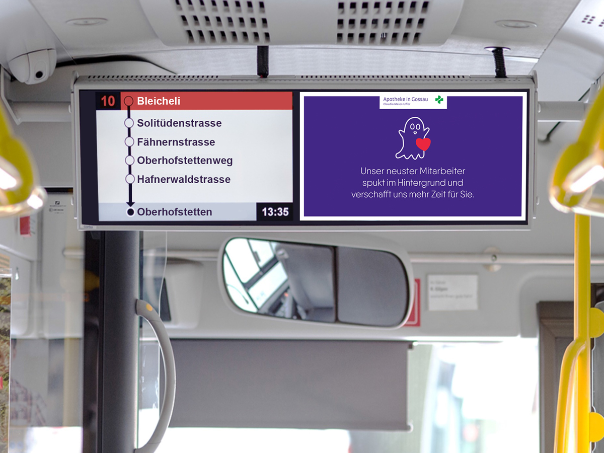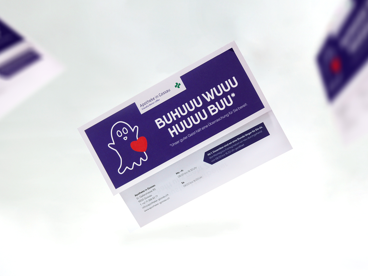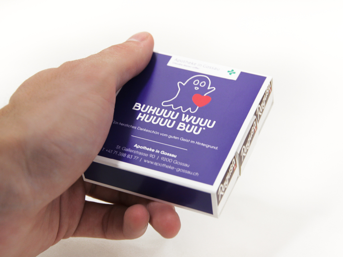 Zur Einweihung eines Lagerroboters in der Apotheke in Gossau hat KA BOOM eine Kampagne gestaltet und den Roboter als Hui Buh in Szene gesetzt – als guten Geist, der die Mitarbeitenden unterstützt.
