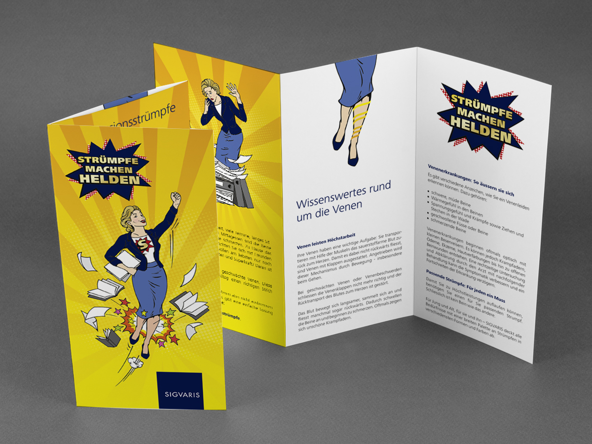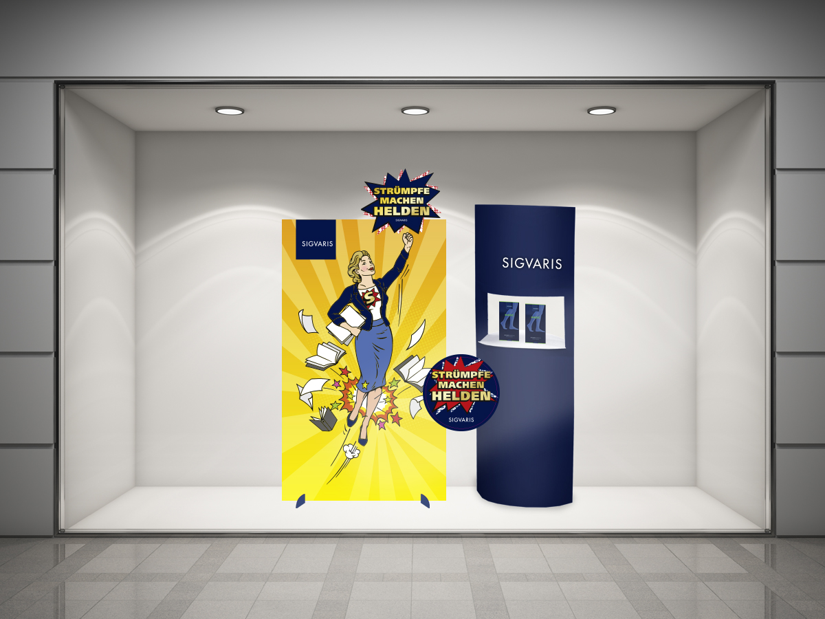 Für den Schweizer Strumpfhersteller Sigvaris hat KA BOOM eine Kampagne für Kompressionsstrümpfe kreiert. Die Strümpfe helfen, die Strapazen des Alltags heldenhaft zu meistern. Deshalb stehen Superhelden im Zentrum der Kampagne – und der Slogan: «Strümpfe machen Helden».