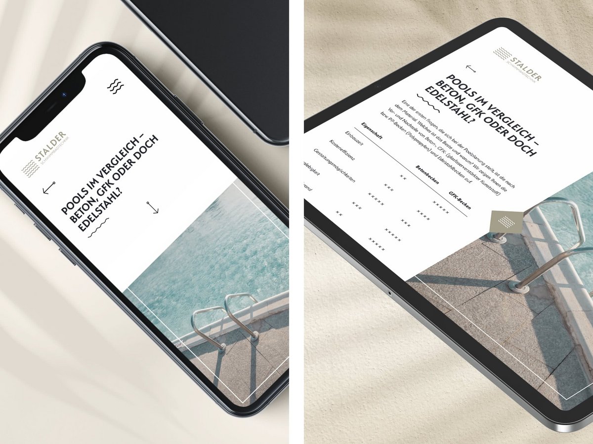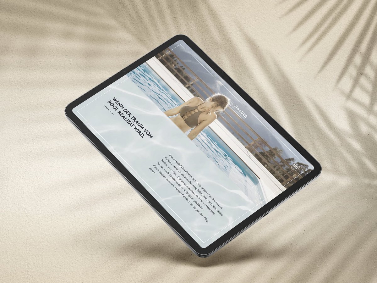 Nicht nur eine neue Website, sondern auch eine visuelle Neugestaltung: Passend zum Start der wärmeren Saison durfte KA BOOM für Stalder Schwimmbadtechnik eine neue Website konzipieren. Das Resultat macht richtig Lust auf die anstehende Badesaison. Eine coole Bild- und Farbwelt sowie eine dazu passende Schrift und stylishe Icons werten die edlen Produkte auf. Das verbesserte User Design, die Suchmaschinenoptimierung sowie die Nutzerfreundlichkeit für Administratoren runden die neue Seite ab. Der Sommer kann kommen.
