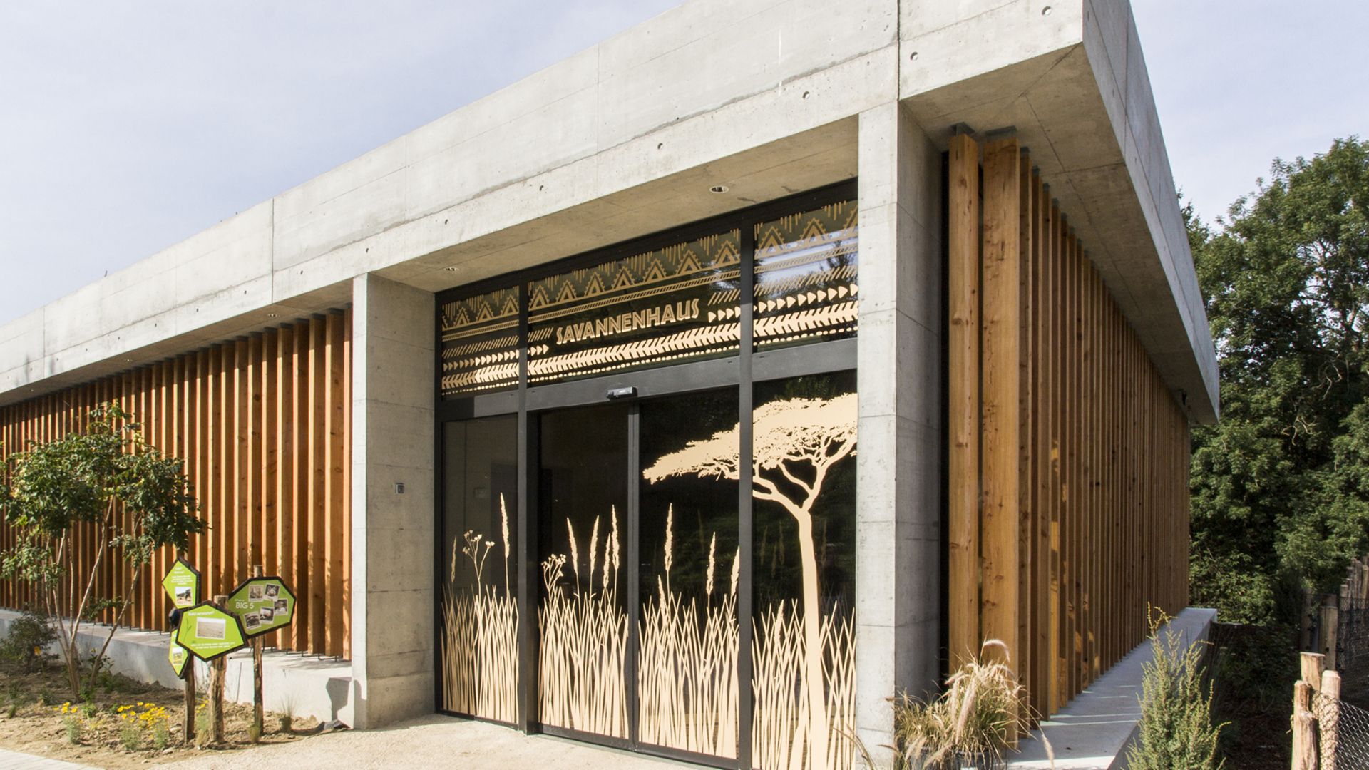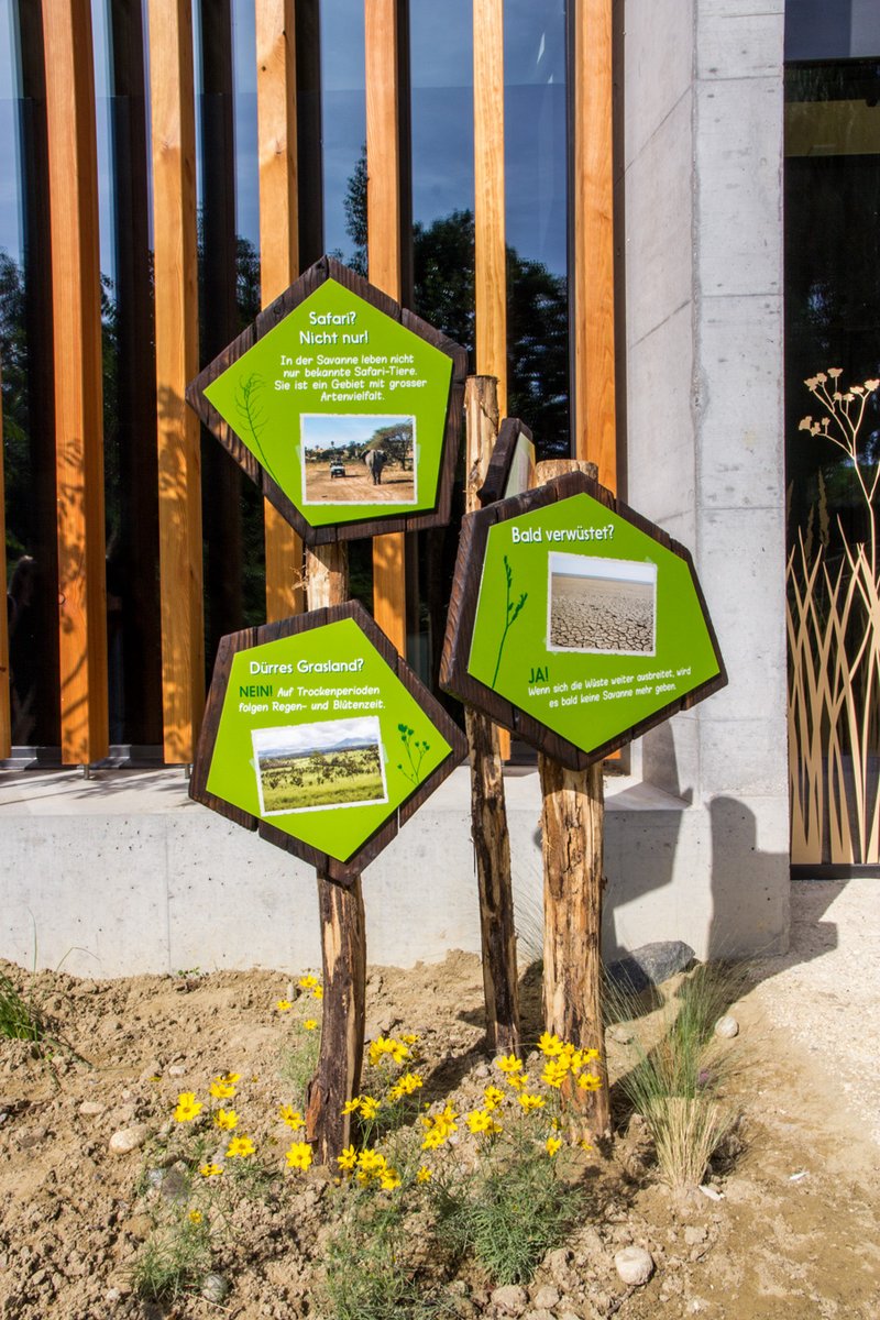 Das neue Savannenhaus ist ein echter Hingucker. Artentafeln, Eingang, Abenteuerweg und mehr: Gestaltungskonzept und Umsetzung stammen von KA BOOM.