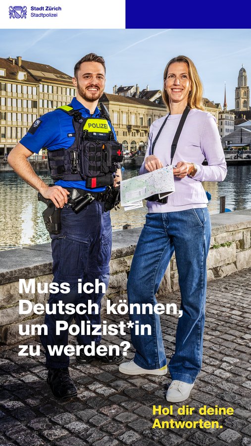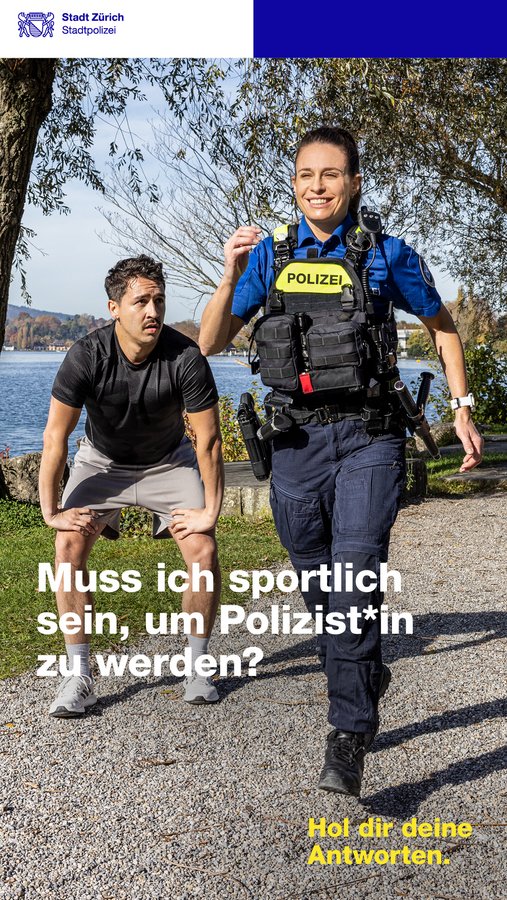 Im Zentrum stehen dabei die Menschen hinter der Uniform. Die Stadtpolizei Zürich wird als vielfältige Arbeitgeberin positioniert, bei der Persönlichkeit, Motivation und Werte entscheidend sind. Die Kampagne richtet sich an Personen mit unterschiedlichen beruflichen Hintergründen und Lebenssituationen und zeigt auf, welche Möglichkeiten und Berufsbilder die Stadtpolizei Zürich bietet.