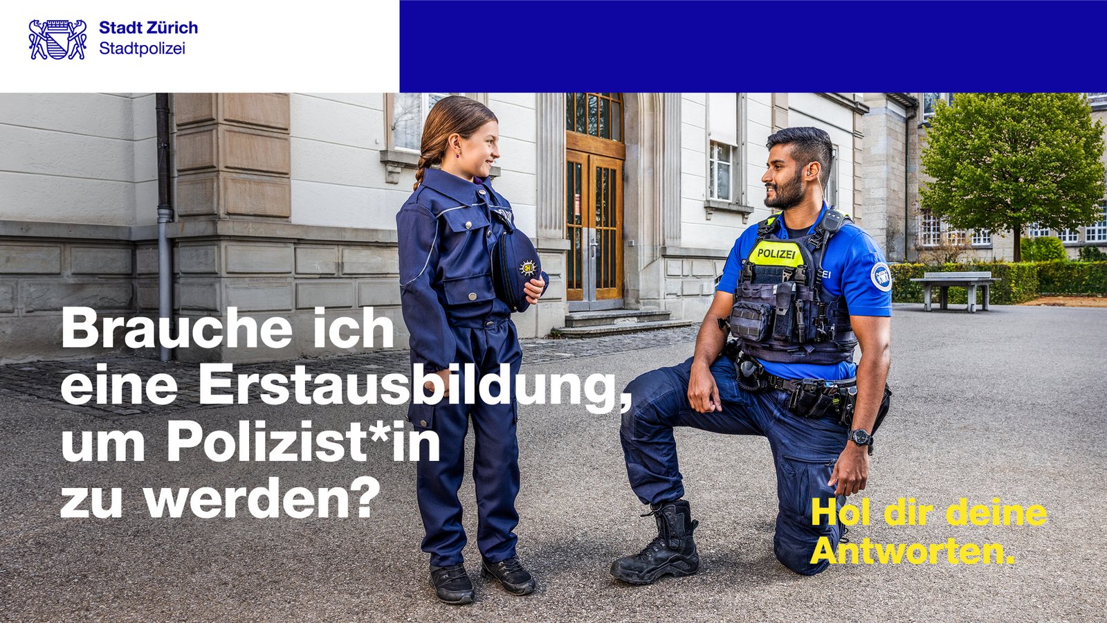 Ausgangspunkt der Kampagne sind Fragen, die sich viele Interessierte stellen. Dazu gehören etwa: «Muss ich eine bestimmte Grösse haben?», «Brauche ich einen Führerschein?», «Wie gut müssen meine Deutschkenntnisse sein?» und «Welche Erstausbildung muss ich mitbringen?» – um Polizist*in zu werden. Die Kampagne greift diese Fragen auf und beantwortet sie klar, direkt und verständlich.