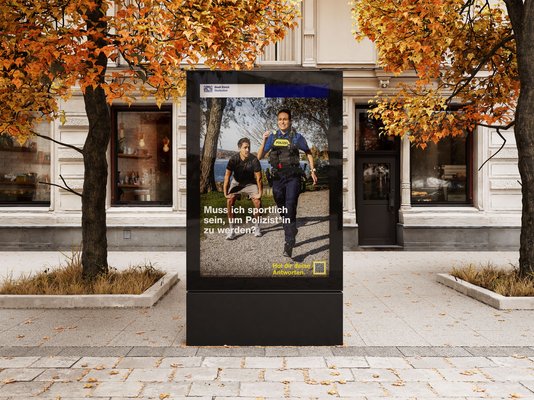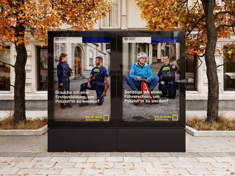 Die Arbeitgeberkampagne wird über digitale Kanäle, Social Media sowie Aussenwerbung ausgespielt. Eine Microsite (www.stadtpolizei.ch/jobs) bündelt Antworten, Informationen und eindeutige Call-to-Actions und erleichtert so den Einstieg in den Bewerbungsprozess.