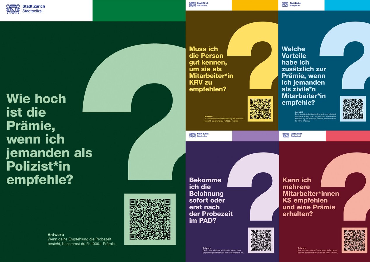 Für die neue Personalwerbung «Polizei» sucht die Stadtpolizei Zürich eine neue umfassende, kreative und innovative Personalwerbung. Im Pitchverfahren überzeugen wir mit der Kampagne «FAQ» und setzten einen Akzent in der Personalgewinnung. Ziel ist es, Fragen zu beantworten, die sich Interessierte im Hinblick auf eine Bewerbung stellen, und den Einstieg in den Bewerbungsprozess mit klaren Informationen zu erleichtern.