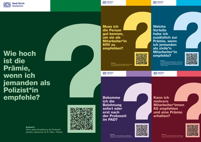 Für die neue Personalwerbung «Polizeiberufe» sucht die Stadtpolizei Zürich eine neue umfassende, kreative und innovative Personalwerbung. Im Pitchverfahren überzeugen wir mit der Kampagne «FAQ» und setzten einen Akzent in der Personalgewinnung. Ziel ist es, Fragen zu beantworten, die sich Interessierte im Hinblick auf eine Bewerbung stellen, und den Einstieg in den Bewerbungsprozess mit klaren Informationen zu erleichtern.